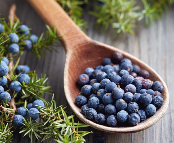Il ginepro è un arbusto sempreverde e spontaneo che cresce su terreni rocciosi – dai pendii montani alle aree costiere –, anche aridi o piovosi, sia con clima freddo alpino sia caldo mediterraneo. Ha foglie aghiformi e pungenti e produce frutti carnosi che vengono molto usati in cucina, nonché per l’estrazione dell’olio essenziale e per ricavare rimedi fitoterapici. Le bacche, fortemente aromatiche, sono ricoperte da un pulviscolo bianco e maturando diventano blu o viola scuro, mentre la polpa è rosso-bruna e contiene piccoli semi. Anche il legno di ginepro emana un profumo gradevole e viene usato per realizzare oggetti di artigianato, oltre che per affumicare carni e salumi, come lo speck.