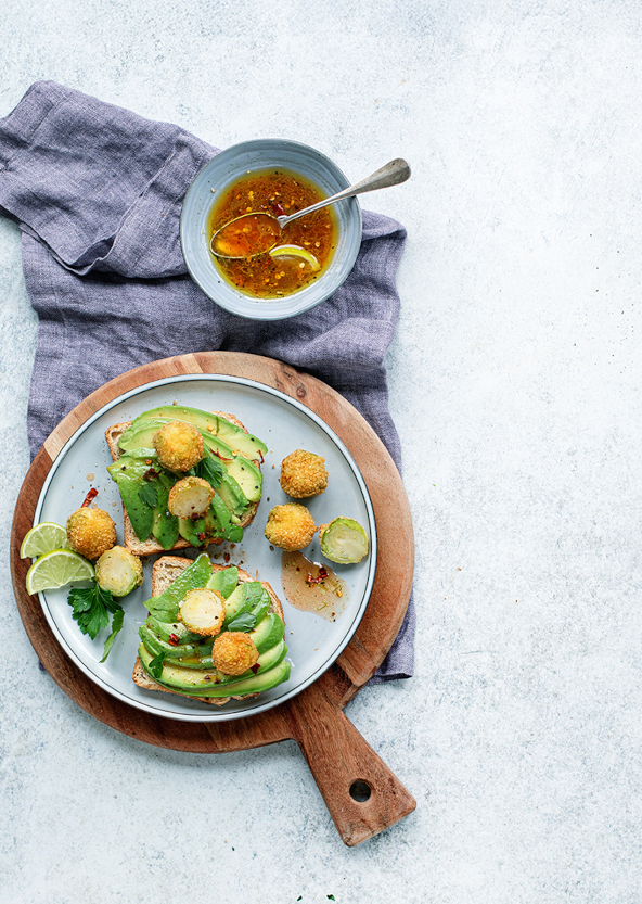 e succo di lime. Disponete l’avocado sul pane tostato, mettetevi sopra i cavoletti impanati e servite con la salsa.