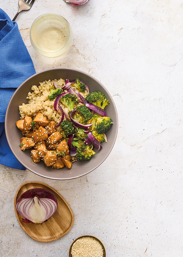 Bowl di quinoa, broccoli e cipolla arrostiti con pollo teriyaki