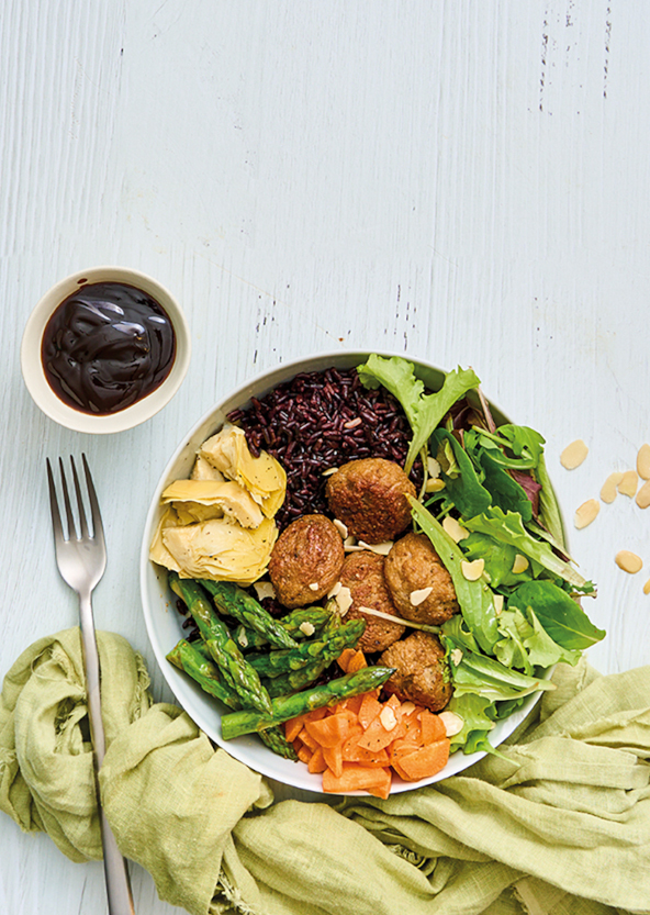 3. Dividete il riso nelle ciotole e adagiate le polpette. Completate con le verdure. Ultimate con le mandorle e condite con la salsa teriyaki.