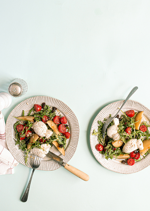 3. Distribuite la rucola nei singoli piatti in modo che faccia da base, adagiatevi sopra i pomodorini, gli spicchi di pesca noce, i nodini di mozzarella, l’uvetta e una manciata di semi di girasole.