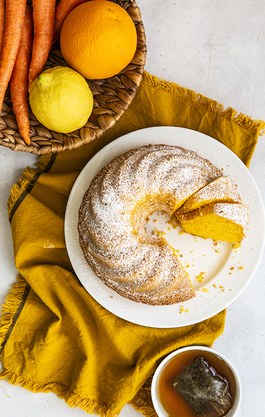 - Montate le uova con lo zucchero e un pizzico di sale ottenendo un composto spumoso e fermo. Incorporate delicatamente gli scarti del centrifugato, poi unite a filo l’olio e il succo d’arancia. Aggiungete la farina e il lievito setacciati, poi la scorza degli agrumi.