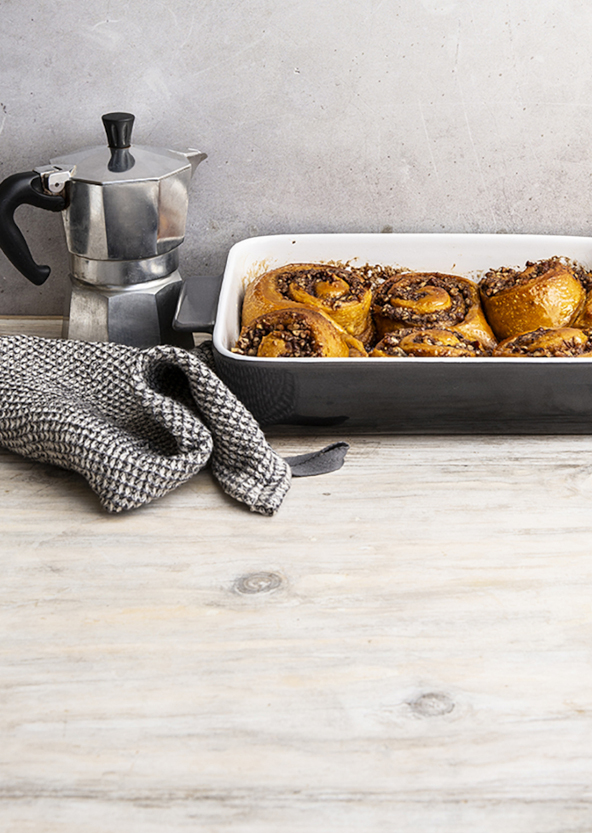 3. Trasferite l’impasto sulla spianatoia infarinata e stendetelo in un rettangolo di circa 30×40 cm, spalmatevi la farcia alle noci, tagliatelo longitudinalmente in 6 strisce di circa 4-5 cm di larghezza, arrotolatele, disponetele in una teglia da 20×30 cm con i bordi alti, fate lievitare ancora per circa 1 ora e poi infornate a 200°C per i primi 10 minuti, abbassando poi a 180°C per i restanti 15-20, fino a doratura. Spennellate i cinnamon rolls ancora caldi con sciroppo d’acero e serviteli una volta freddi.