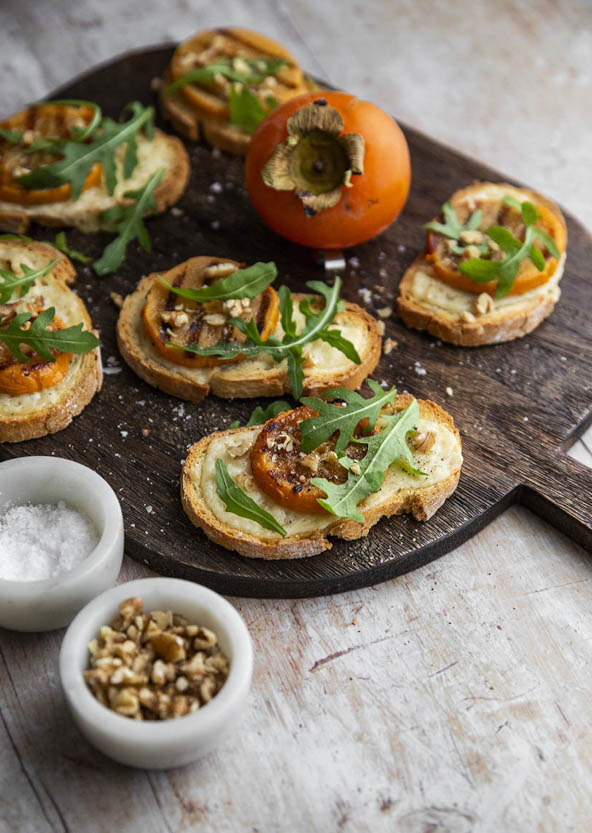 Crostoni al forno con provolone, cachi grigliati, rucola e noci