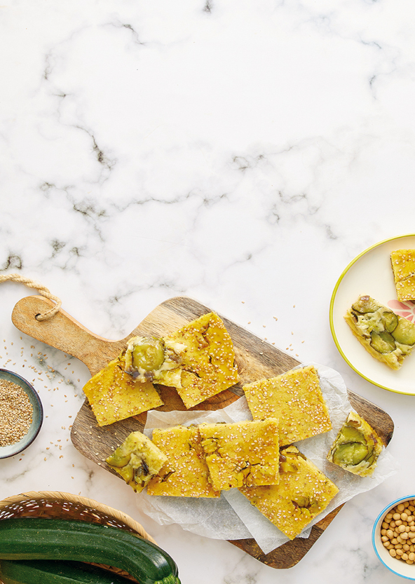 4. Aggiungete in superficie i semi di sesamo, un filo d’olio e cuocete in forno ventilato a 180°C per 30 minuti. 5. Fate raffreddare la frittata su una gratella e non tagliatela fino a quando non sarà tiepida.