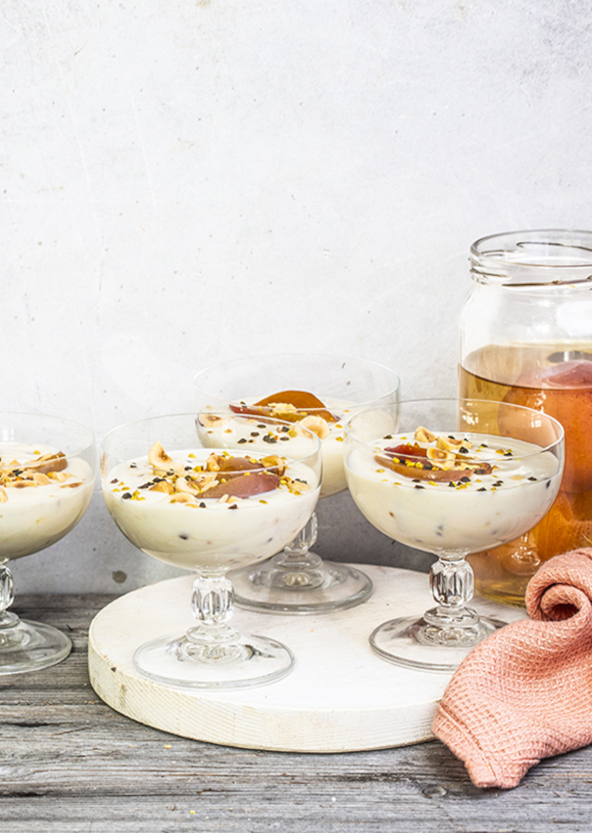 Fool di yogurt con pesche allo sciroppo, nocciole e polline