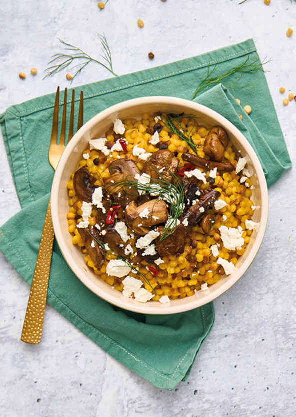 3. Impiattate la fregola con i funghi adagiati sopra. Cospargete con la feta, il finocchietto e il peperoncino.
