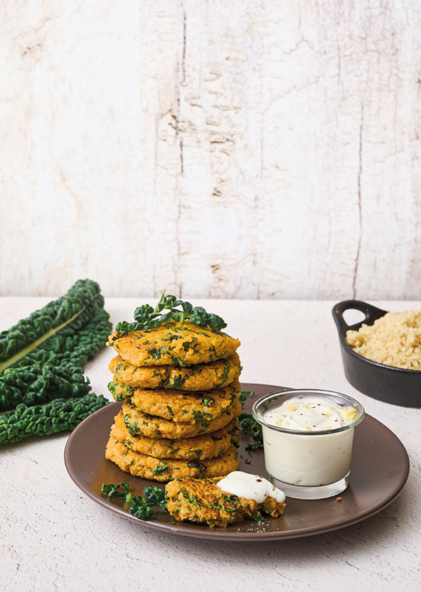 Frittelle di patate dolci e quinoa con salsa di yogurt allo zenzero