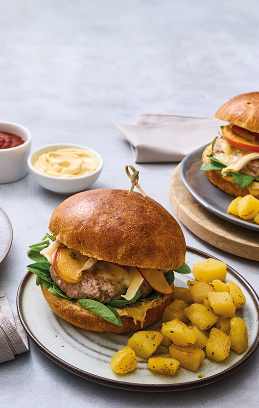 Hamburger di maiale con brie, mele al miele e patate