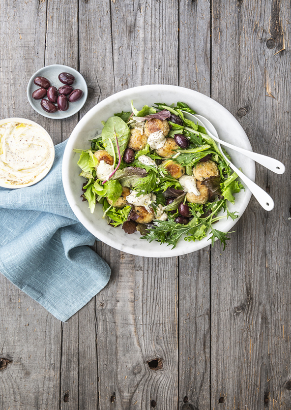 Insalata con polpette, mandorle, prezzemolo e salsa di yogurt