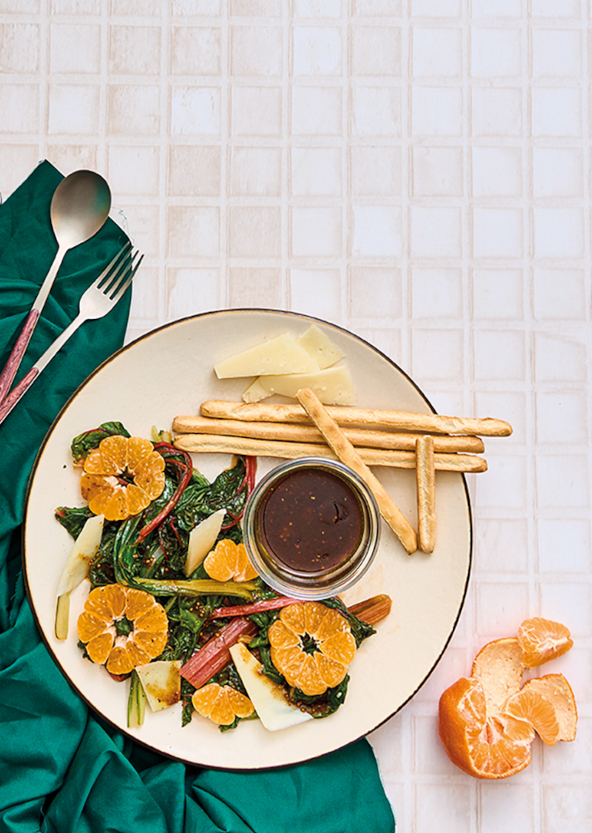 2. In un piatto capiente unite le bietole e i mandarini. Tagliate a scaglie il pecorino e aggiungetelo sull’insalata. Condite con la salsa e completate con i grissini.