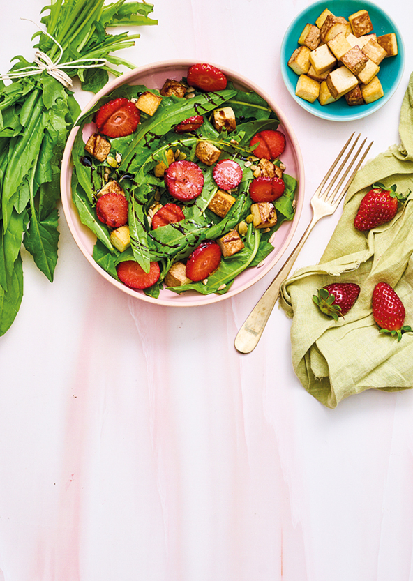 2. Mescolate le cicorie con il tofu, le fragole e i semi. Condite l’insalata con olio, aceto balsamico, sale e pepe.