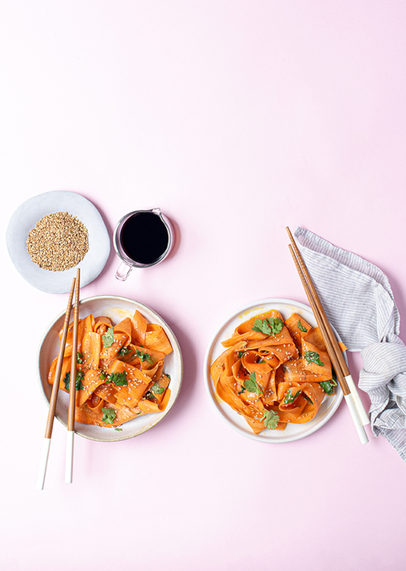 1. Pelate le carote e tagliatele per il lungo in nastri sottilissimi. Raccoglietele in una ciotola e conditele con la salsa di soia, lo sciroppo d’acero, il succo di limone, l’aceto di riso e una leggera spolverata di sale.