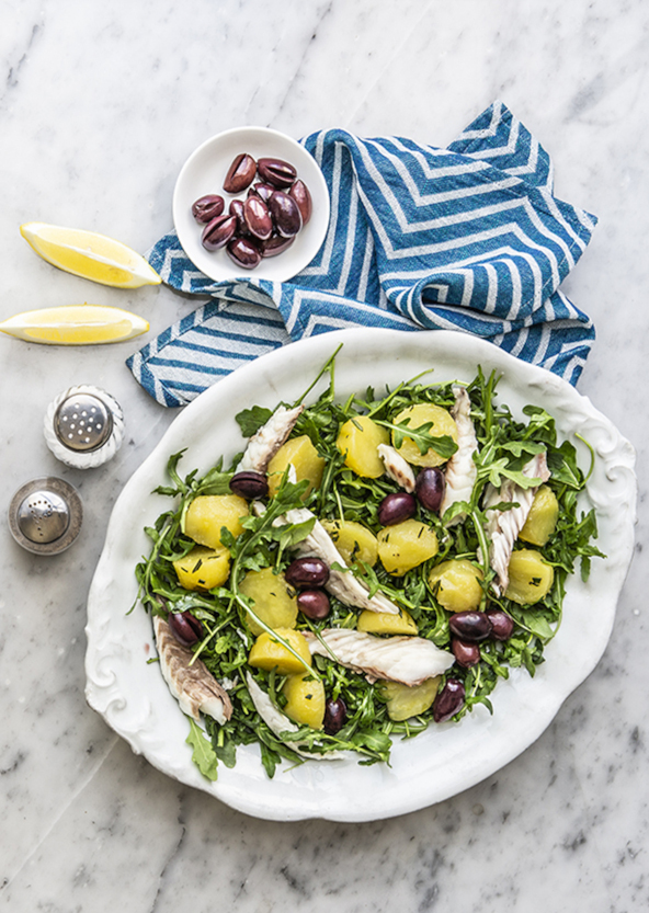 Insalata di orata, patate, rucola, Parmigiano e olive