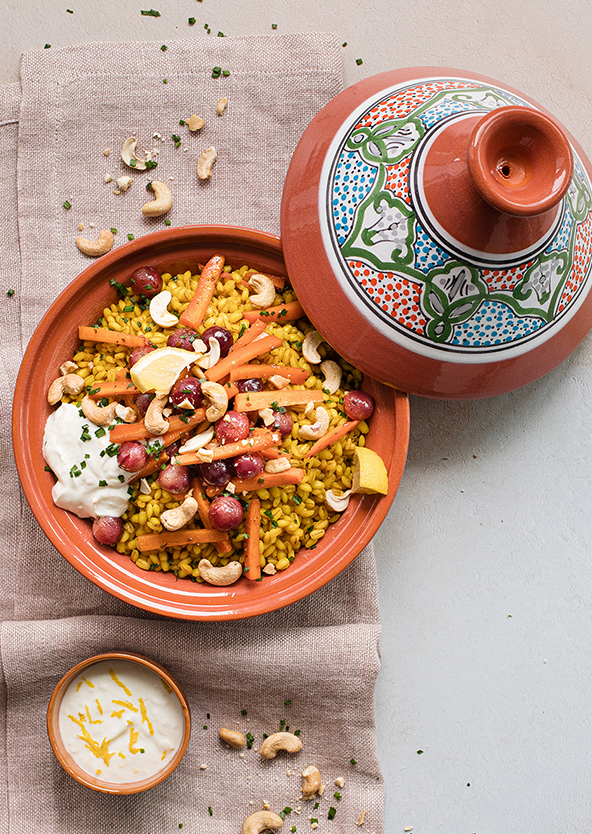 Insalata speziata d’orzo con carote e uva arrostite, anacardi e salsa di yogurt