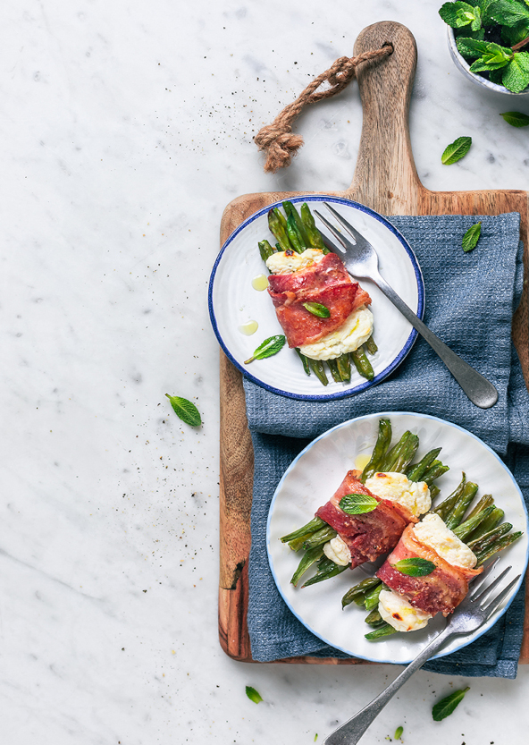 - Suddivideteli in 8 mazzetti da 5 fagiolini ciascuno. Sistemate sul piano di lavoro una fetta di pancetta, adagiatevi un mazzetto di fagiolini e un cucchiaio di caprino, quindi richiudete riportando i lembi della pancetta verso il centro.