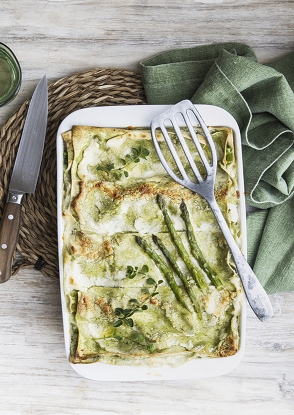 5. In una pirofila imburrata alternate, nell’ordine, uno strato di lasagne, qualche cucchiaio di besciamella, uno strato sottile di crema di ricotta e parmigiano, uno di caciotta e mozzarella tagliate sottili al coltello, uno di asparagi, fino a esaurimento degli ingredienti e lasciando da parte poca crema alla ricotta e qualche punta di asparagi per finire. Terminate con un ultimo strato di pasta, crema di ricotta e punte di asparagi. Aggiungete qualche foglia di origano e cospargete con il resto del parmigiano, poco pepe appena macinato a piacere e fiocchetti di burro.