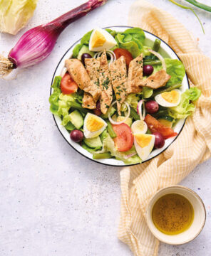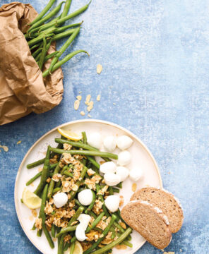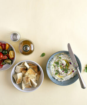 3. Sistemate le zucchine in una pirofila e unite la rucola, le olive e un filo d’olio. Completate con la salsina allo yogurt versata delicatamente e le mandorle tostate.