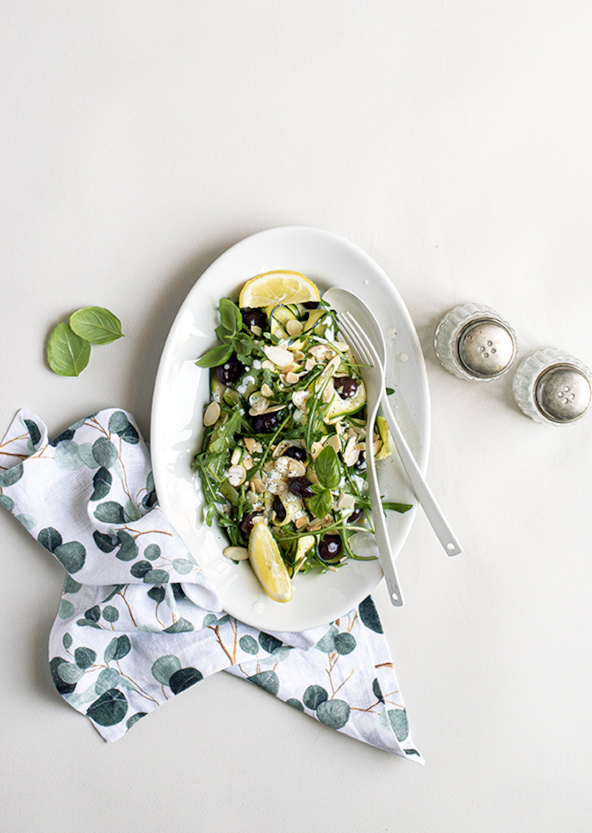 Nastri di zucchine con rucola, olive, salsa allo yogurt e basilico