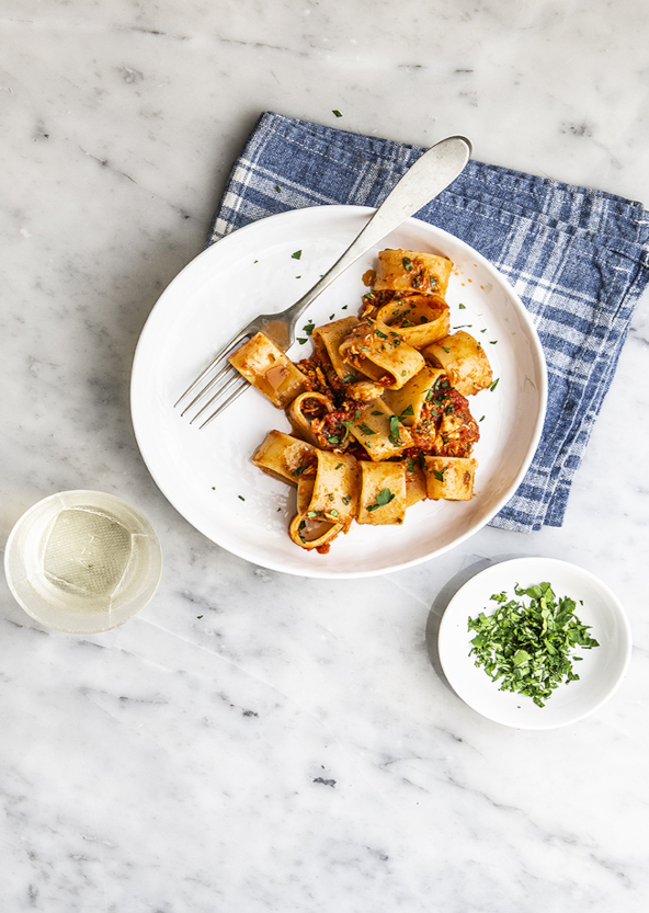 3. Unite un filo d’olio a crudo al sugo e nel frattempo lessate la pasta in abbondante acqua salata; poco prima di scolarla al dente, versate qualche cucchiaio di acqua di cottura nella padella del condimento e accendete di nuovo il fuoco.