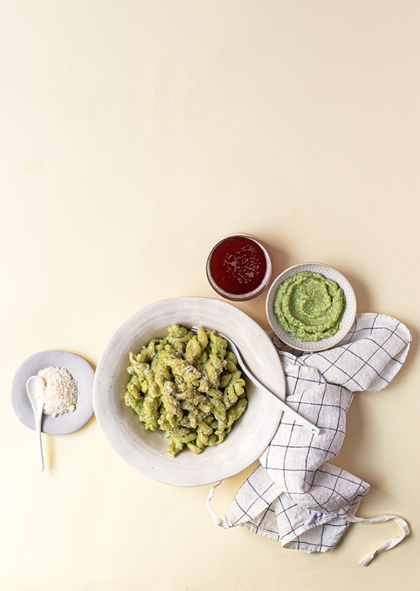 Pasta con pesto di sedano, formaggio e mandorle