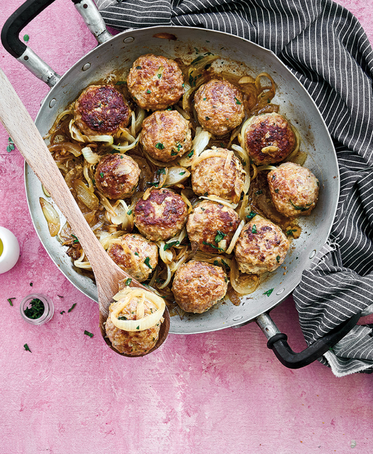 - Tagliate le cipolle a fettine sottili. In una padella antiaderente scaldate il burro e l’olio, unite le cipolle, salatele e fatele appassire per 5 minuti. Appena iniziano a dorare toglietele dalla padella e tenetele da parte. Aggiungete ancora un filo di olio e inserite le polpettine. Fatele dorare rigirandole più volte. Aggiungete le cipolle, bagnate con la birra e proseguite la cottura per 10-15 minuti. Cospargete con prezzemolo fresco tritato e servite.