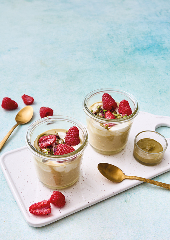 2. Prima di gustare, distribuite il porridge nelle ciotoline, aggiungete dello yogurt, un filo di crema di pistacchio, pistacchi tritati e i lamponi. Se piace, completate con un filo di miele o di sciroppo d’acero.