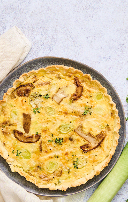 - In una ciotola mescolate uova, panna, sale e pepe. Unite i porri, i funghi tagliati grossolanamente e tre quarti della groviera; mescolate, versate sulla brisée e aggiungete del timo. Ultimate con il restante formaggio.