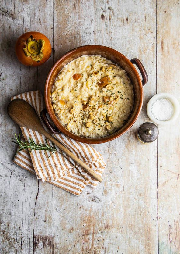 3. Arrivati a due terzi della cottura aggiungete i cubetti di caco e il rosmarino tagliato a pezzetti (potete lasciarne un po’ per finire il piatto). Stemperate la polpa di caco nell’ultimo mestolo e aggiungetela al risotto alla fine; completate la cottura e, in ultimo, mantecate con il burro e la crescenza tagliata a pezzetti. Aggiustate di sale se serve.
