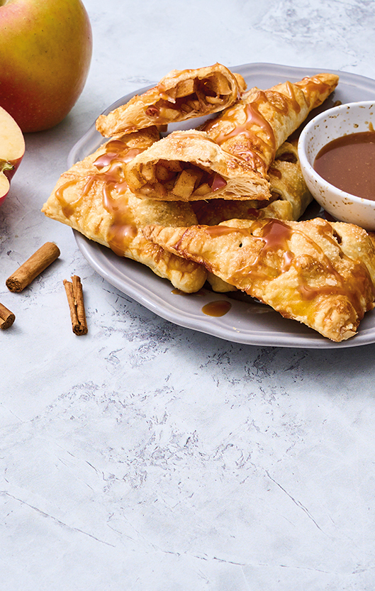 lo zucchero e la cannella. Fate raffreddare il tutto. - Tagliate la sfoglia in 8 quadrati uguali, distribuite le mele al centro di ciascuno. Formate dei triangoli ripiegando i bordi, sigillate i fagottini con una forchetta e fate 3 tagli in superficie. Spennellateli con l’uovo sbattuto e spolverateli con lo zucchero bianco.