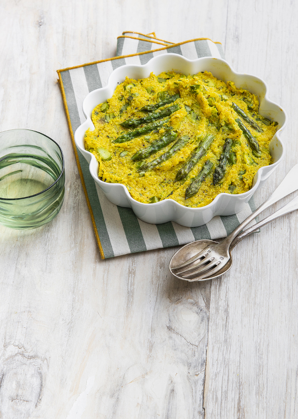 la curcuma più un pizzico di sale e pepe. Mescolate bene aggiungendo il latte e, in un secondo momento, le erbe tritate e la quinoa; amalgamate con cura e, in ultimo, unite gli asparagi in pezzi.