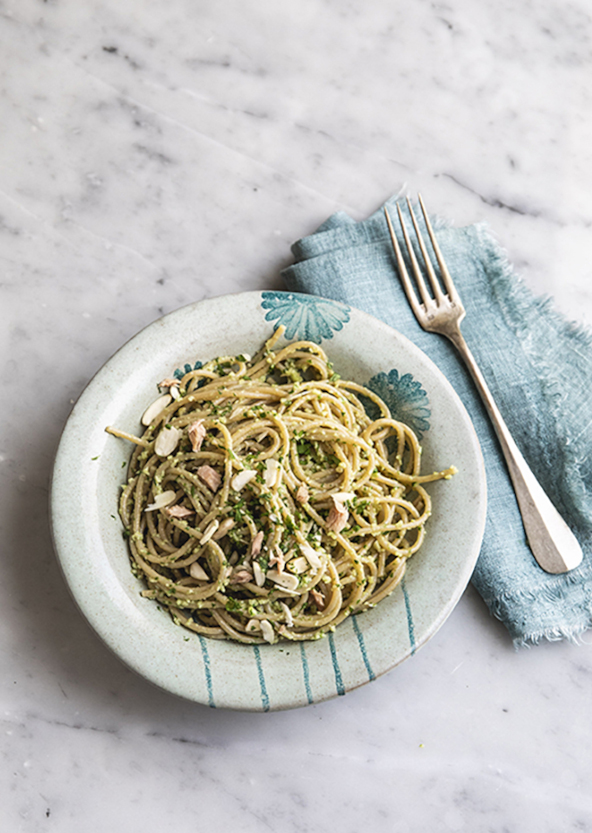 4. Cuocete gli spaghetti in abbondante acqua salata per 11-12 minuti (o per il tempo indicato sulla confezione), scolandoli al dente e usando un paio di cucchiai dell’acqua di cottura per stemperare il sugo di mandorle e prezzemolo, avendo cura di prelevare l’acqua verso la fine della cottura in modo che sia più ricca di amido e renda il sugo più cremoso.