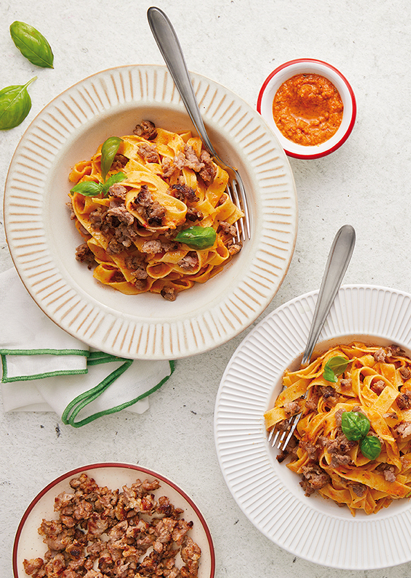 Tagliatelle con crema di peperoni rossi e salsiccia