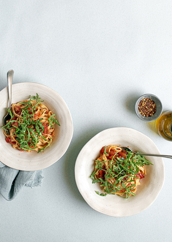 Tagliatelle fredde con pomodoro, aglio, peperoncino e rucola