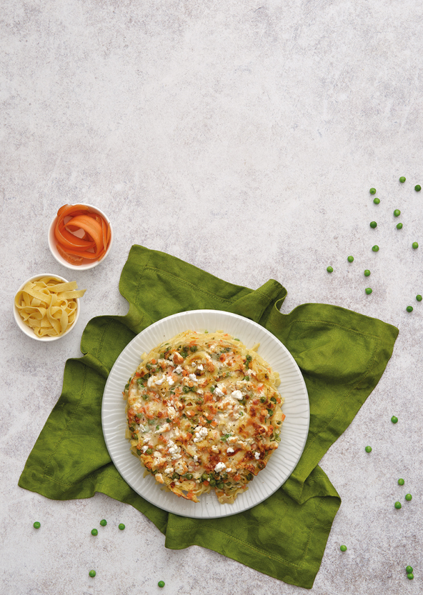 Timballo di tagliatelle primaverile con carote, piselli e feta