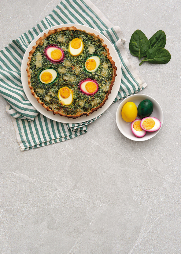 2. Foderate una teglia con la pasta sfoglia e riempitela con il composto. Sgusciate le uova, tagliatele a metà e adagiatele sopra il ripieno. Ultimate con la groviera tenuta da parte.
