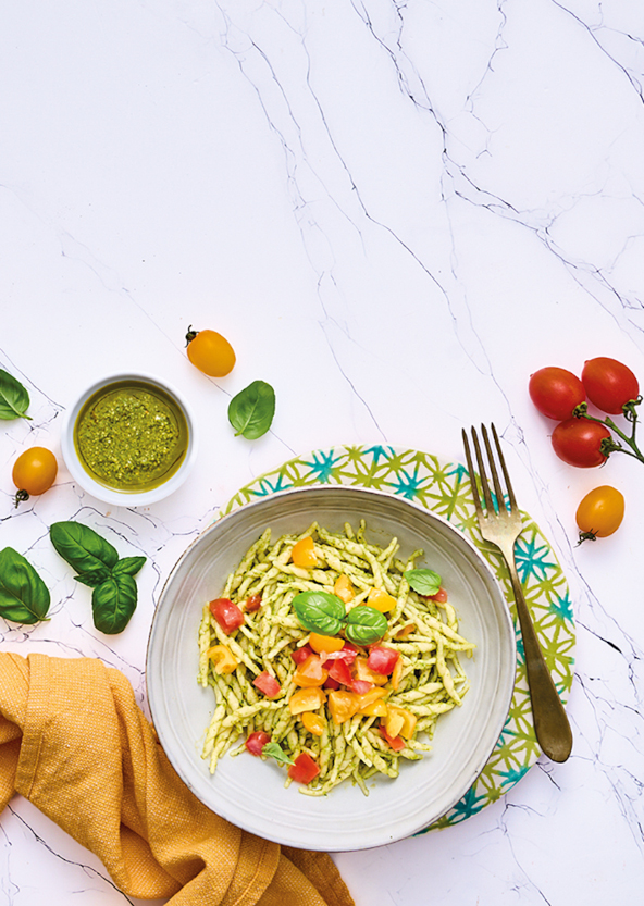 2. Cuocete la pasta al dente in abbondante acqua salata. Conditela con il pesto fuori dal fuoco, mescolando accuratamente. Impiattate e ultimate con i pomodorini,
