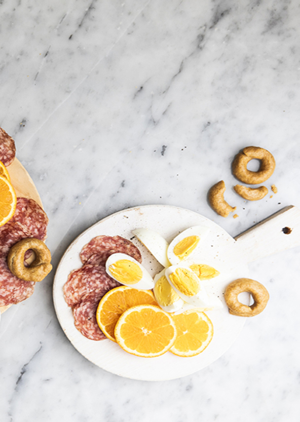 2. Sgusciate le uova e tagliatele a spicchi. Sistemate i salumi e la ricotta su uno o più taglieri o piatti da portata; aggiungete le fettine d’arancia, le olive e i taralli.