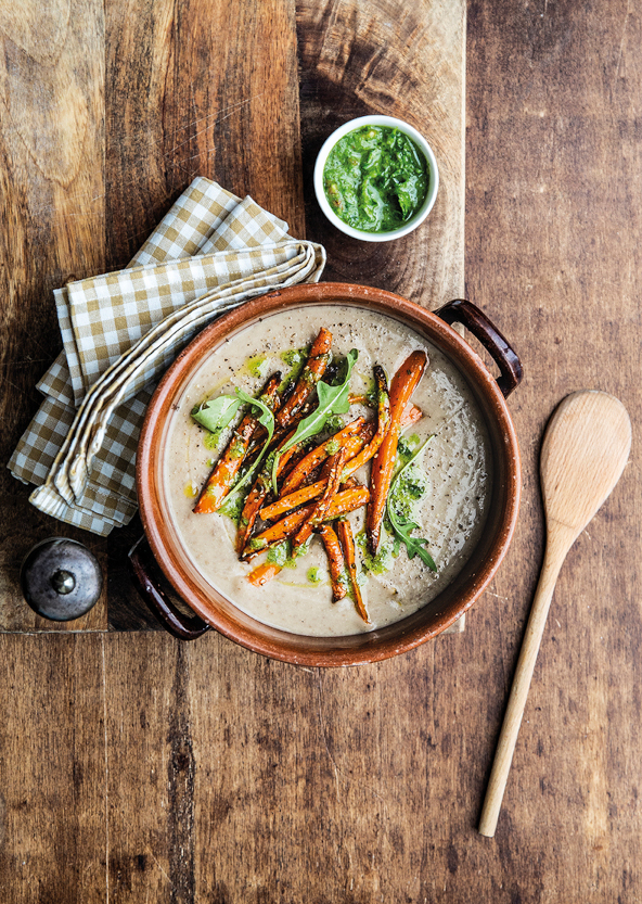 5. Servite la vellutata calda con una spolverata di pepe, le carote arrosto e il pesto.