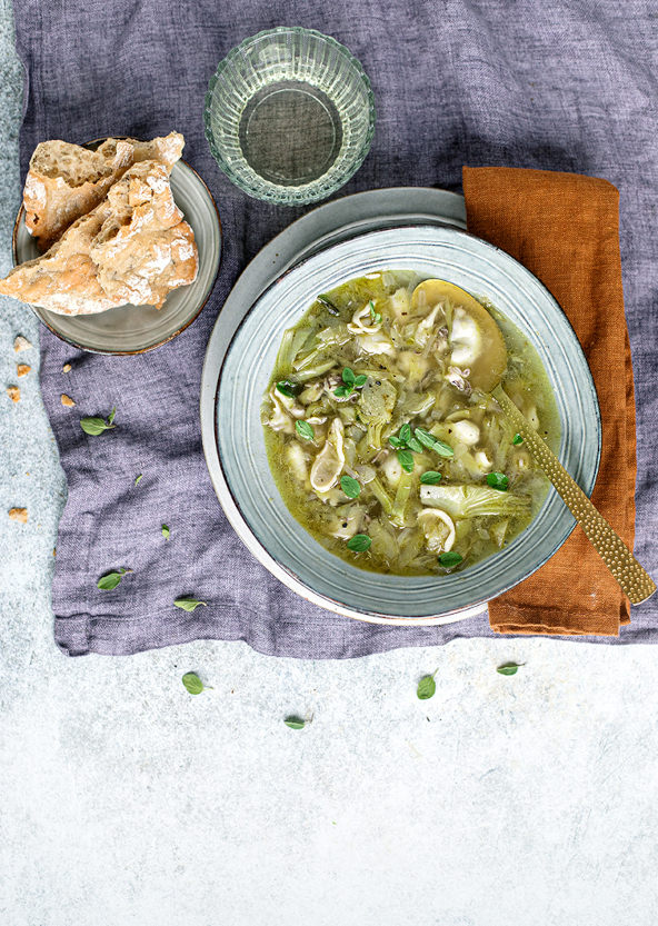 3. Unite i calamaretti alla zuppa, regolate di sale e pepe, e cuocete per altri 5-7 minuti, giusto il tempo che i calamaretti diventino teneri ma non gommosi. Togliete il rametto di maggiorana e servite la zuppa calda, ultimando con olio e maggiorana fresca.