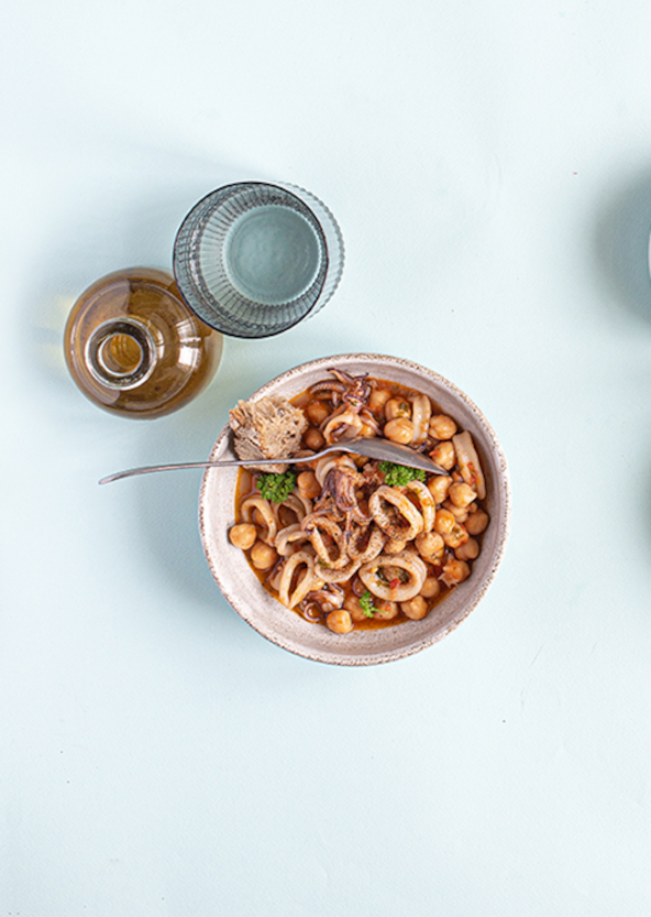 3. Scolate i ceci e sciacquateli bene per eliminare il liquido di conservazione. Uniteli ai calamari, mescolate e aggiungete un po’ d’acqua senza coprire completamente la zuppa. Regolate di sale e pepe, coprite con un coperchio senza chiudere del tutto e fate cuocere a fiamma bassa per altri 20-25 minuti, finché i ceci non si saranno ammorbiditi.